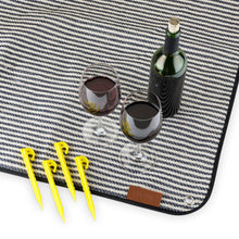 With its nautical pinstripes and waterproof lining, this blanket calls for a romantic picnic under a shady tree or a sunny lunch at the beach. A genuine leather carrier and four picnic stakes are conveniently included for a carefree outdoor date.