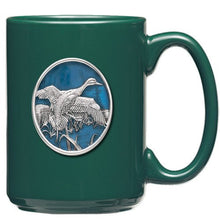 This coffee mug is decorated with a fine pewter casting. It is microwaveable and dishwasher safe with no heat cycle.. The glass coffee mug is 16 ounces, and the ceramic coffee mug is 15 ounces.