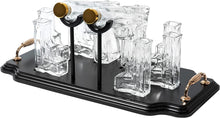 - The Wine Savant presents a high quality glass pistol decanter set revolutionized for the world of spirits. It features two gun shaped decanters that each hold 300ml of liquid and six 3 oz pistol shot glasses. Serve up your favorite wine, whiskey, rum, or any liquor drink in style with this unique gift for any occasion.