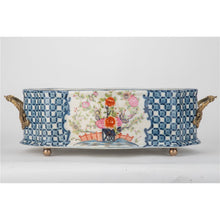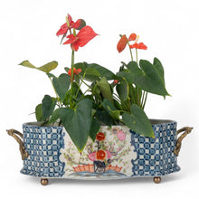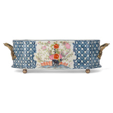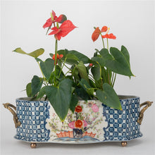 This elegant porcelain oval cachepot, measuring 8.5 inches long, 6 inches wide, and 7 inches high, features a vibrant multicolor floral design framed by a classic blue lattice pattern. Adorned with ornate bronze ormolu handles and feet, the piece showcases timeless European charm and artisanal craftsmanship. Perfect as a decorative planter, it brings refined beauty to indoor gardens, tabletops, or accent spaces. The “Garden Trellis” Oblong Scalloped Basin blends functionality and elegance, making it a standout addition for floral arrangements or as a statement décor piece.