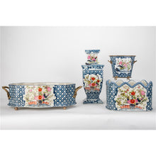 6.5"H Porcelain Oblong Scalloped Basin With Multicolor Floral In Blue Lattice With Bronze Ormolu - Garden Trellis