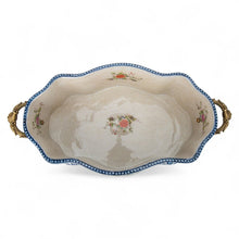 Porcelain Oblong Scalloped Basin With Multicolor Floral In Blue Lattice With Bronze Ormolu - Garden Trellis