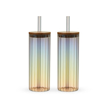 Whether you’re sipping iced coffee, lemonade, or a cocktail, these ribbed glass tumblers with lids and straws are the perfect drinking glasses. The ribbed texture and rainbow luster finish make these a gorgeous way to take your favorite drinks on the go.