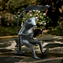 Reading Frog Birdfeeder with LED Light SKU: 34937 COLLECTION: Garden THEME: Nature & Whimsy FUNCTION: Birdfeeders    Material: AluminumProduct: 18.5"H 15.5"W 9.5"D , Wt 8.0 lbs UPC: 725739349373
