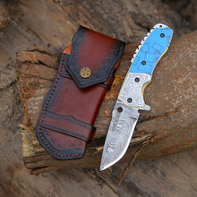 Reckoner Damascus Folding Knife with Turquoise Resin Handle