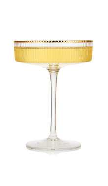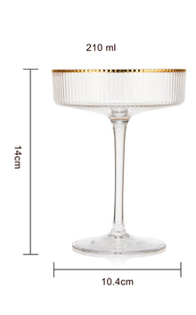 - Unleash your inner mixologist by adding these Ripple Ribbed Gold-Rim Glasses to your bar. The ripple effect on these glasses makes them irresistible, a conversation starter set to say the least! Enjoy a refreshing mimosa or prosecco cocktail with your brunch guests or entertain in style with a refined wine tasting experience. Add a touch of sophistication to your home bar with the Cocktail Coupe Goblet Glasses. Each glass has a height of 5.5", a diameter of 4", and a capacity of 8 ounces.