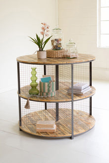 This round iron and wood three-tiered display with mesh is perfect for kids' toys and books or decor items for a simple shop display. Use one as your living room ottoman or near the mudroom for storage. This versatile piece can be used in a variety of settings.
