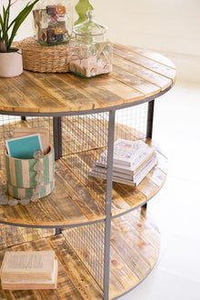 ROUND IRON AND WOOD THREE TIERED DISPLAY UNIT