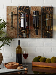 - This unique and rustic wall-mounted wine rack will attract a lot of attention, and not just because it holds your favorite wine! Four wooden slats mount to your wall and feature simple metal wine holders that allow you to place four bottles upside down. A great accessory for your dining room, you’ll always have your next bottle of wine within reach!