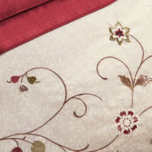 Polyester faux silk, embroidered, pieced, 8oz/sq yard polyester filling, faux silk bedskirt and pillows;