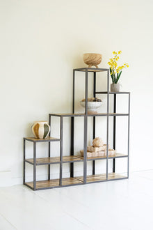 Iron and wood stair-step display shelves work side by side, back to back, or in an L configuration for store displays or industrial bookshelves. This set of two is the answer. How will you arrange them?