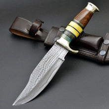 Skywalker Handmade Custom 1095 Damascus Bowie Knife with Sheath - 12.0" Overall with Exotic Rose Wood & Bone Composite Handle, Brass Guard & Pommel, Clip Point Damascus Blade with Hand Stitched Leather Sheath, Pro Knife Sharpening & Personalized