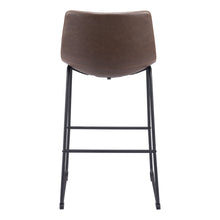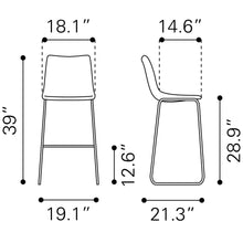 This barstool's seat and back are built with a sculpted design for comfort, It's upholstered in a soft 100% Polyurethane fabric, with a slim profile metal base and two crossbars for stability. The frame is finished in matte black, for a universal appeal.