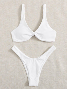 Solid Tie Bikini Padded Bra High Leg Bandage Push Up Bikini Set Brazilian Swimsuit Women Swimwear Rib Bikini Set High Cut Spaghetti Strap Two Piece Swimsuit Bathing Suit