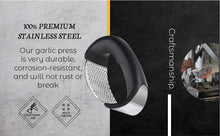 100% PREMIUM STAINLESS STEEL. Our garlic press is very durable, corrosion-resistant, and will not rust or break.