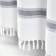 This Stripe Woven Textured Yarn Dyed Recycled Cotton Shower Curtain made with eco-friendly recycled cotton features a classic stripe design and fits in almost any bathroom setting. The tassel fringe detailing adds a stylish, unique charm to accent the traditional horizontal stripes.