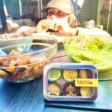 Six-pack set of Taco themed magnets, made in the USA from recycled bottle caps. Our magnetic expressions make fabulous and unique gifts and can be used in the kitchen, office or on any magnetic surface. Each magnet set comes in the display tin (just like in the picture) and the magnets are strong enough to hold the entire tin on a magnetic surface for display.