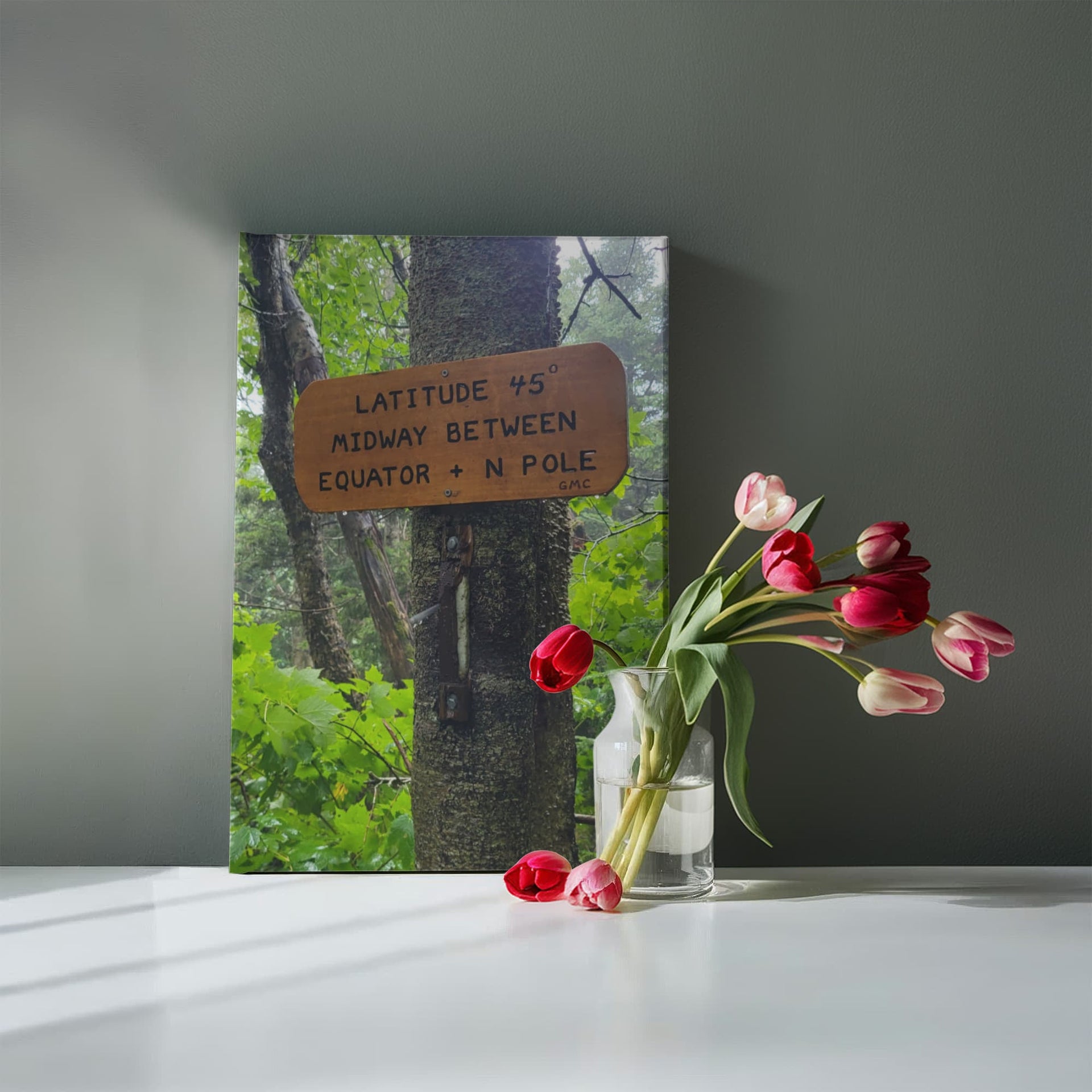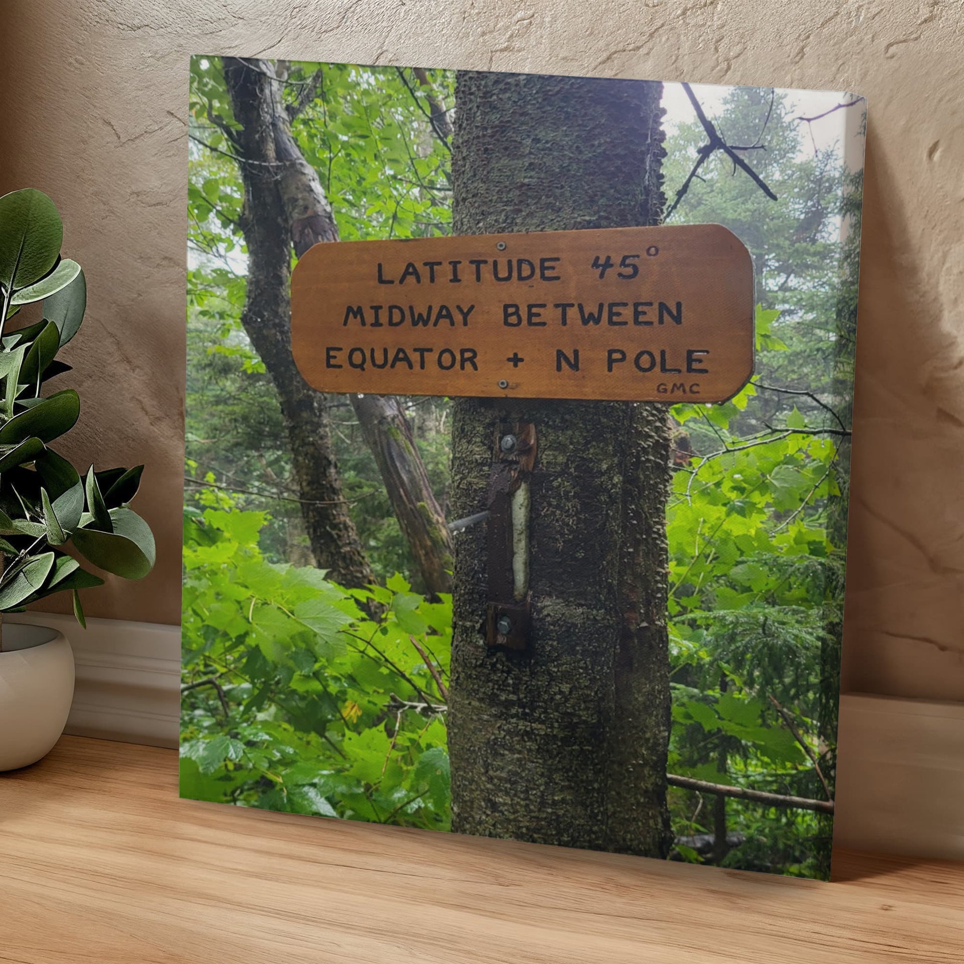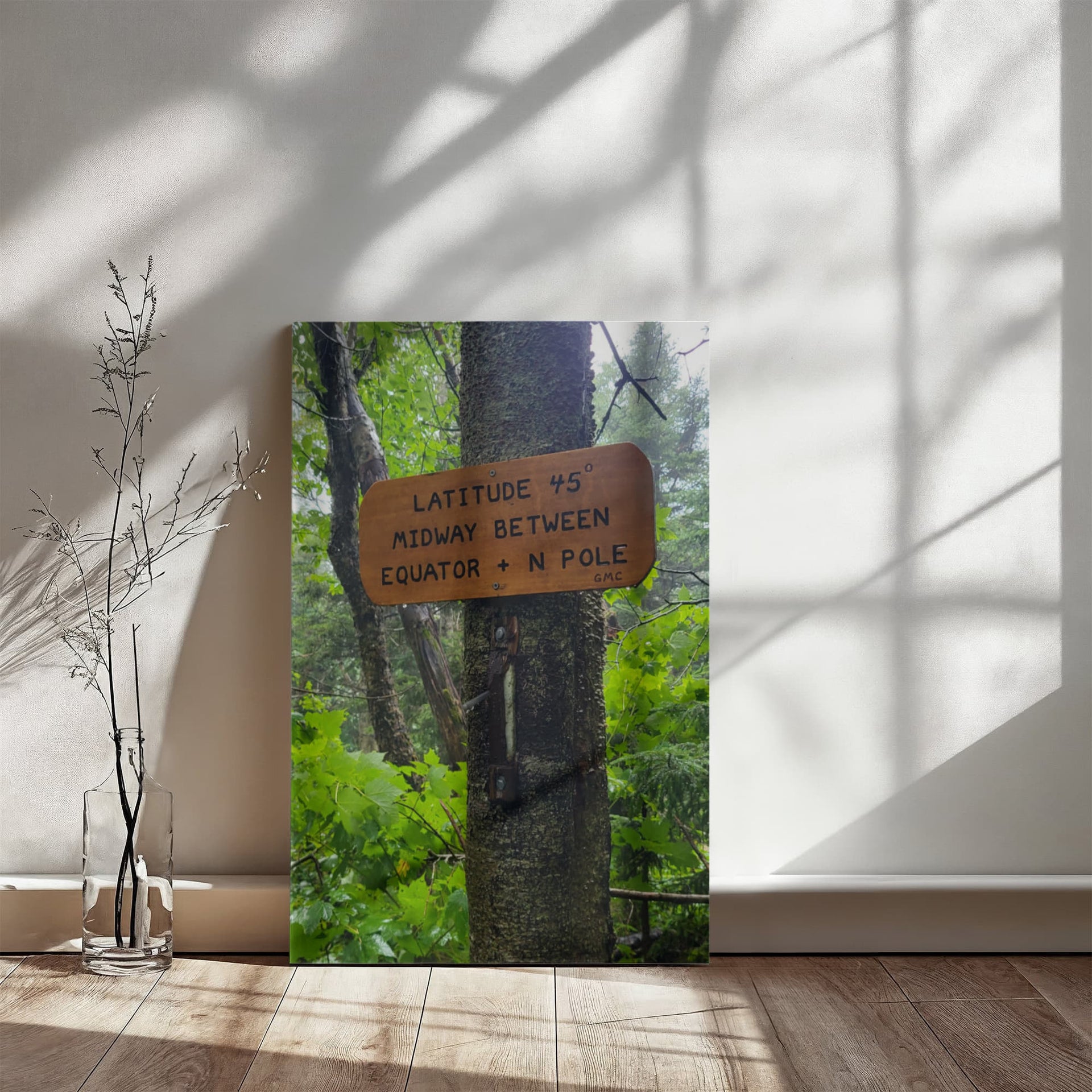 This rustic trail sign marks a significant geographic milestone—standing exactly halfway between the Equator and the North Pole. A reminder of the vastness of our planet, discovered in the heart of Vermont's wilderness.