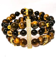 Tiger Eye Multi Strand Bracelet. Made with 18k gold plated long spacer, 12mm Natural tiger eye beads, 8mm smooth onyx beads, and crown spacers. A Beautiful Natural Tiger Eye Multi-Strand Bracelet that looks and smells amazing.