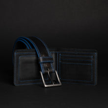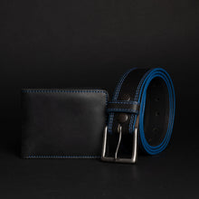 Made from tough full grain leather, this set features blue stitches on smooth leather. Just as Poseidon had his trident, this set has it's own trident: Strength, flexibility, and durability. Blue double stitching and a gunmetal buckle finish the look.