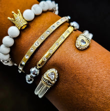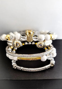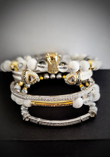 5pc. Stacked Bracelet comes with stainless steel cable wire open bangle with clear quartz heart shaped on the end, closed silver Bracelet with Swarovski crystals from Borun America, Beaded bracelet with stainless steel gold spacer made with 6mm faceted silver Hematite and 3mm gold hematite beads, signature Bracelet made with howlite, clear quartz, silver and gold hematite, and top bracelet made with stainless steel gold crown with 6mm howlite faceted clear quartz with silver and gold hematite beads.If you need a peaceful sleep, clarity and direction, or protection and balance, this 5pc. Stacked Bracelet set is for you.