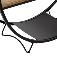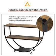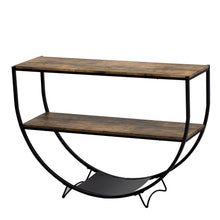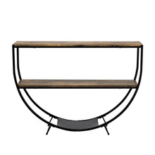 Its base showcases a demilune shape awash in an antique black finish and a metal lower shelf lends a touch of industrial charm.Two tiers of wood shelving offers large space for your books, magazines and decor.