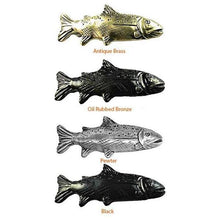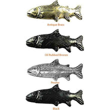 This cabinet pull features a beautifully designed trout figure. It will look stunning on your cabinets at the cabin or at home. The cabinet pull (or handle) features a cast, one piece construction that has a finish that will outlive your cabinets. Available in four finishes: Antique Brass, Oil Rubbed Bronze, Pewter, and Black.