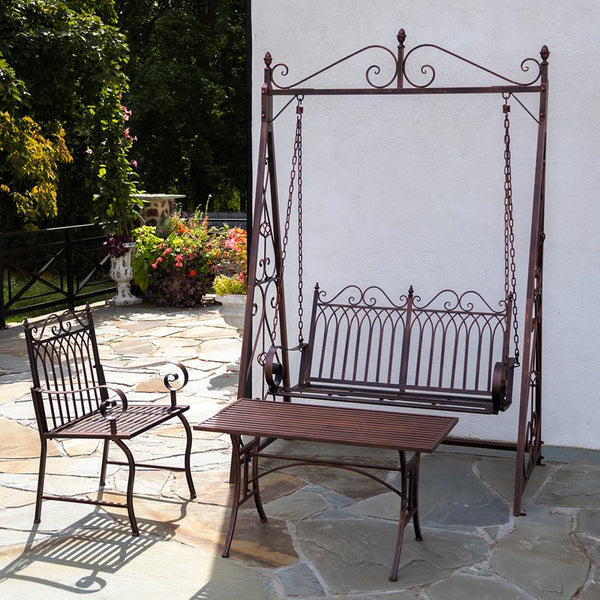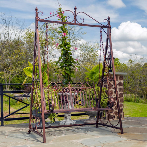 LIMITED INVENTORY - ONLY ONE PIECE LEFT; PRE-ORDER AVAILABLE Transform your yard, deck, or patio into a place everyone yearns to be with the new "Tserovani" Iron Swing Bench. Expertly...