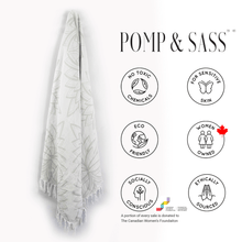 While traveling, Cathy brought a Pomp & Sass towel onto a plane by wearing it like a scarf. She used it as a blanket and rolled it as a pillow during the flight. She tucked it into her cary on after the flight because her destination was warm. When she arrived at her resort she used it at the beach then wore it to dinner as shawl. It washed in the sink and was dry for the next morning. It became a sarong at the pool and dried several times as she went back and forth from the water. During her vacation it was beautiful in photos and made her life easier. Cathys' story is often repeated from other customers.