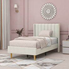 This Twin size Mid-Century Platform Bed Frame with Cream Velvet Upholstered Headboard showcases a low-profile silhouette and clean lines for a mid-century modern look in your bedroom or guest room. The frame is built from engineered wood, and it rests on splayed legs with a light brown finish. This bed is upholstered in linen and/or velvet with a medley of colors to choose from that best suits your style. We love how the tall wingback headboard is padded with chic channel tufting, so you have a cushioned spot to relax for some late-night reading. Best of all, a box spring is not necessary. A mattress is not included. Note: The color might be affected by lighting conditions.