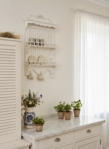 Constructed from high-quality wood and painted in a timeless antique white, this rustic wall-mounted plate rack not only adds aesthetic value but also ensures durability and long-term use. The delicate carvings along the top edge bring a French-inspired elegance, making it a standout décor piece even in small spaces.