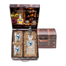 West Virginia University Heritage Decanter with 3D Top Mountaineer and 2 Glasses with Chest Box