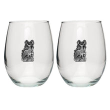 This is a set of two 12 ounce glass goblets with a fine pewter logo medallion bonded to the side. It could be used to serve water, wine or other beverages. Made in USA.
