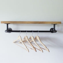 Wood shelf with Hang Bar comes in two different sizes, 24" and 36" hang bar. The wood shelf is 5" long than the hang bar. 31" shelf for 24" hang bar, 41" shelf for 36" hang bar.