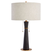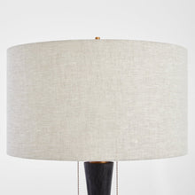 The Wright table lamp's black, brushed mango wood base tapers from a brass-finished base to a wheat linen shade that softens the lamp's illumination, creating a pleasantly inviting atmosphere. Two...