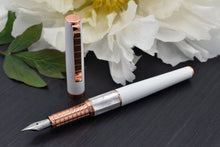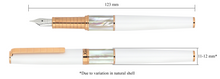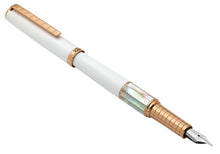This lightweight brass Fine Fountain Pen is finished in a matte White exterior paired with oceanic white mother-of-pearl and rose gold-plated fittings. Weighing only 29 grams (1.02 ounces), this series of Xezo pens was designed for speedy and comfortable writing, hence the name Speedmaster™. It's an affordable gift pen with a comfortable design for men and women with medium to small hand sizes. Its pull-off cap can be securely posted on the tapered lower barrel for added grip and weight while writing, or it can be left off for a lighter touch. Equipped with a German-made, stainless steel, fine nib, this pen delivers an approximate stroke width of 0.33 mm. With its impeccable design, meticulous craftsmanship, and thoughtful details, our pen promises a delightful writing experience for connoisseurs who appreciate the fusion of aesthetics and practicality.
